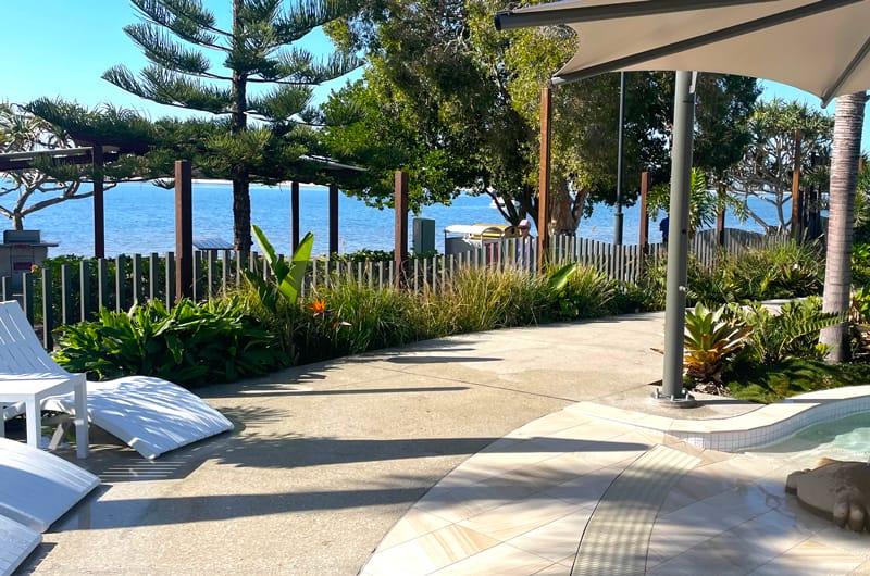 In addition to the floating-style picket fence, frameless glass pool fence panels on spigots in other pool areas offer an unobstructed view of the pool area.